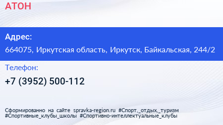 АТОН по адресу 664075, Иркутская область, Иркутск, Байкальская, 244/2 в дальнейшем Организация, размещена в следующих категориях: