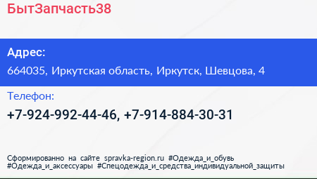 БытЗапчасть38 по адресу 664035, Иркутская область, Иркутск, Шевцова, 4 в дальнейшем Организация, размещена в следующих категориях: