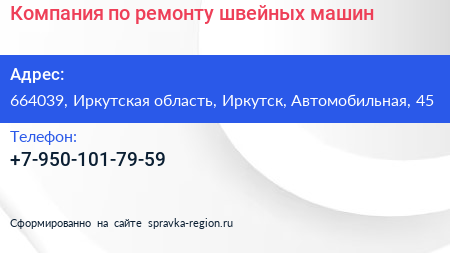 Компания по ремонту швейных машин по адресу 664039, Иркутская область, Иркутск, Автомобильная, 45 в дальнейшем Организация, размещена в следующих категориях: