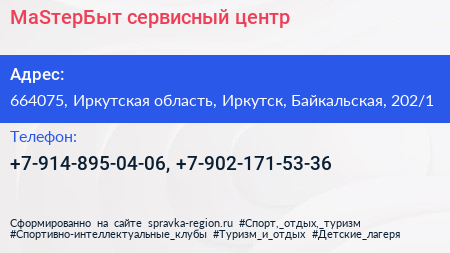 МаSтерБыт, сервисный центр по адресу 664075, Иркутская область, Иркутск, Байкальская, 202/1 в дальнейшем Организация, размещена в следующих категориях: