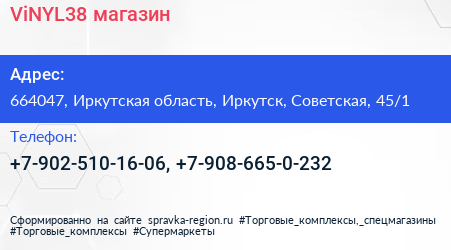 ViNYL38, магазин по адресу 664047, Иркутская область, Иркутск, Советская, 45/1 в дальнейшем Организация, размещена в следующих категориях: