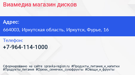Виамедиа, магазин дисков по адресу 664003, Иркутская область, Иркутск, Фурье, 16 в дальнейшем Организация, размещена в следующих категориях: