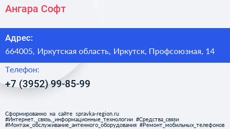 Ангара-Софт по адресу 664005, Иркутская область, Иркутск, Профсоюзная, 14 в дальнейшем Организация, размещена в следующих категориях: