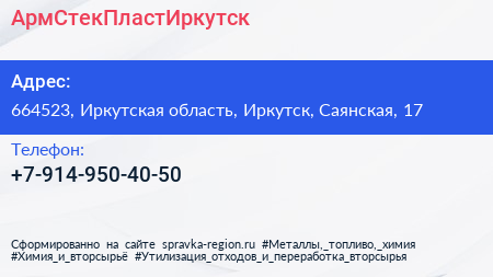 АрмСтекПластИркутск по адресу 664523, Иркутская область, Иркутск, Саянская, 17 в дальнейшем Организация, размещена в следующих категориях: