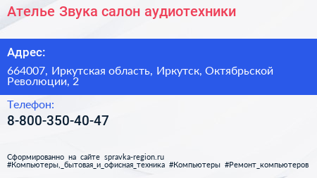 Ателье-Звука, салон аудиотехники по адресу 664007, Иркутская область, Иркутск, Октябрьской Революции, 2 в дальнейшем Организация, размещена в следующих категориях: