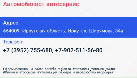 Автомобилист, автосервис по адресу 664009, Иркутская область, Иркутск, Ширямова, 34а в дальнейшем Организация, размещена в следующих категориях: