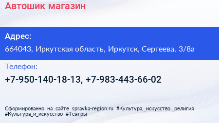 Автошик, магазин по адресу 664043, Иркутская область, Иркутск, Сергеева, 3/8а в дальнейшем Организация, размещена в следующих категориях: