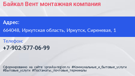 Байкал-Вент, монтажная компания по адресу 664048, Иркутская область, Иркутск, Сиреневая, 1 в дальнейшем Организация, размещена в следующих категориях: