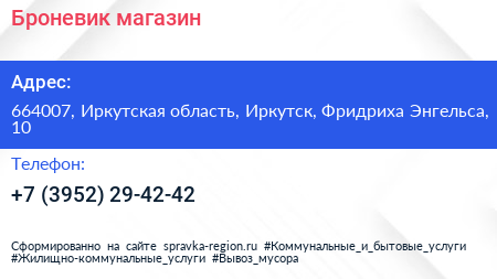 Броневик, магазин по адресу 664007, Иркутская область, Иркутск, Фридриха Энгельса, 10 в дальнейшем Организация, размещена в следующих категориях:
