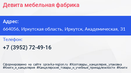 Девита, мебельная фабрика по адресу 664056, Иркутская область, Иркутск, Академическая, 31 в дальнейшем Организация, размещена в следующих категориях: