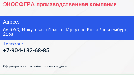 ЭКОСФЕРА, производственная компания по адресу 664053, Иркутская область, Иркутск, Розы Люксембург, 216а в дальнейшем Организация, размещена в следующих категориях: