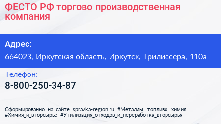 ФЕСТО-РФ, торгово-производственная компания по адресу 664023, Иркутская область, Иркутск, Трилиссера, 110а в дальнейшем Организация, размещена в следующих категориях: