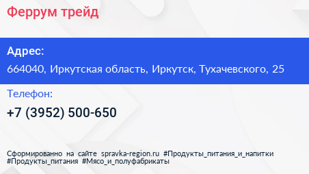 Феррум трейд по адресу 664040, Иркутская область, Иркутск, Тухачевского, 25 в дальнейшем Организация, размещена в следующих категориях: