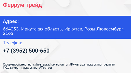 Феррум трейд по адресу 664053, Иркутская область, Иркутск, Розы Люксембург, 216а в дальнейшем Организация, размещена в следующих категориях: