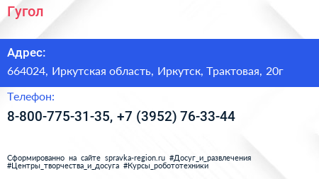 Гугол по адресу 664024, Иркутская область, Иркутск, Трактовая, 20г в дальнейшем Организация, размещена в следующих категориях: