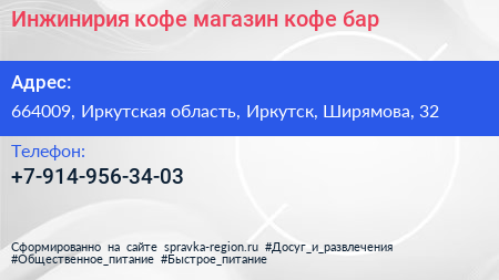 Инжинирия кофе, магазин-кофе-бар по адресу 664009, Иркутская область, Иркутск, Ширямова, 32 в дальнейшем Организация, размещена в следующих категориях: