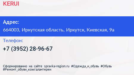 KERUI по адресу 664003, Иркутская область, Иркутск, Киевская, 9а в дальнейшем Организация, размещена в следующих категориях: