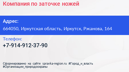 Компания по заточке ножей по адресу 664050, Иркутская область, Иркутск, Ржанова, 164 в дальнейшем Организация, размещена в следующих категориях: