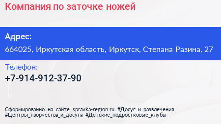 Компания по заточке ножей по адресу 664025, Иркутская область, Иркутск, Степана Разина, 27 в дальнейшем Организация, размещена в следующих категориях: