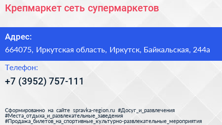 Крепмаркет, сеть супермаркетов по адресу 664075, Иркутская область, Иркутск, Байкальская, 244а в дальнейшем Организация, размещена в следующих категориях: