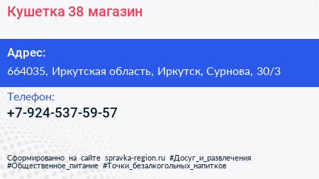 Кушетка 38, магазин по адресу 664035, Иркутская область, Иркутск, Сурнова, 30/3 в дальнейшем Организация, размещена в следующих категориях: