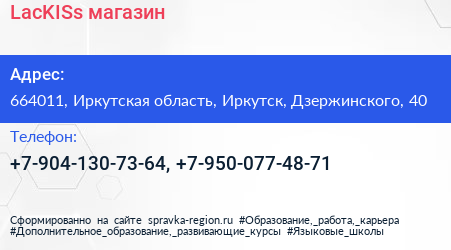 LacKISs, магазин по адресу 664011, Иркутская область, Иркутск, Дзержинского, 40 в дальнейшем Организация, размещена в следующих категориях: