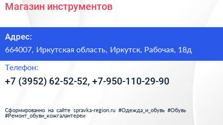 Магазин инструментов по адресу 664007, Иркутская область, Иркутск, Рабочая, 18д в дальнейшем Организация, размещена в следующих категориях: