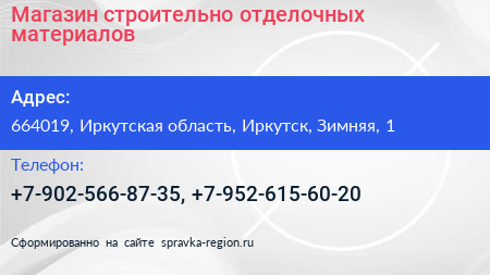 Магазин строительно-отделочных материалов по адресу 664019, Иркутская область, Иркутск, Зимняя, 1 в дальнейшем Организация, размещена в следующих категориях: