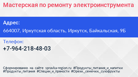 Мастерская по ремонту электроинструмента по адресу 664007, Иркутская область, Иркутск, Байкальская, 9Б в дальнейшем Организация, размещена в следующих категориях: