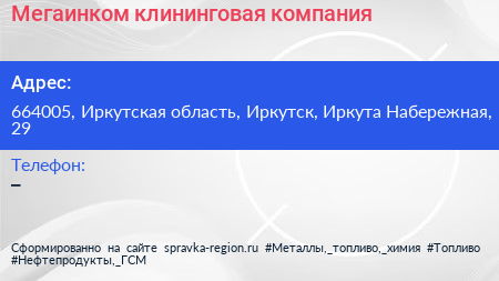 Мегаинком, клининговая компания по адресу 664005, Иркутская область, Иркутск, Иркута Набережная, 29 в дальнейшем Организация, размещена в следующих категориях: