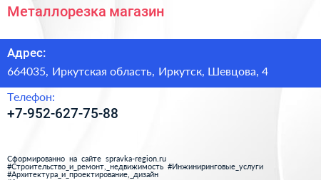 Металлорезка, магазин по адресу 664035, Иркутская область, Иркутск, Шевцова, 4 в дальнейшем Организация, размещена в следующих категориях: