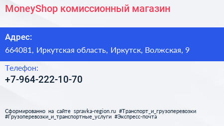 MoneyShop, комиссионный магазин по адресу 664081, Иркутская область, Иркутск, Волжская, 9 в дальнейшем Организация, размещена в следующих категориях: