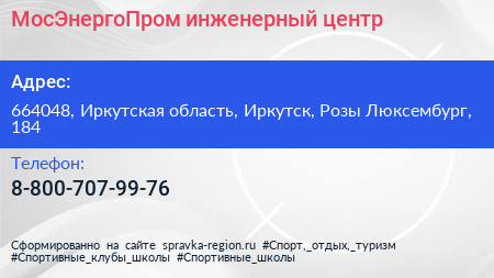 МосЭнергоПром, инженерный центр по адресу 664048, Иркутская область, Иркутск, Розы Люксембург, 184 в дальнейшем Организация, размещена в следующих категориях: