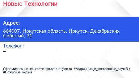 Новые Технологии по адресу 664007, Иркутская область, Иркутск, Декабрьских Событий, 31 в дальнейшем Организация, размещена в следующих категориях:
