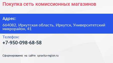 Покупка, сеть комиссионных магазинов по адресу 664082, Иркутская область, Иркутск, Университетский микрорайон, 41 в дальнейшем Организация, размещена в следующих категориях: