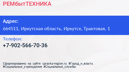 РЕМбытТЕХНИКА по адресу 664511, Иркутская область, Иркутск, Трактовая, 1 в дальнейшем Организация, размещена в следующих категориях: