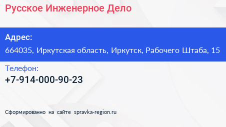 Русское Инженерное Дело по адресу 664035, Иркутская область, Иркутск, Рабочего Штаба, 15 в дальнейшем Организация, размещена в следующих категориях: