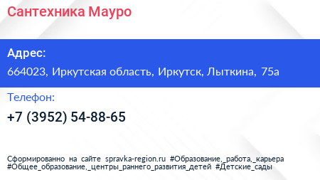 Сантехника Мауро по адресу 664023, Иркутская область, Иркутск, Лыткина, 75а в дальнейшем Организация, размещена в следующих категориях: