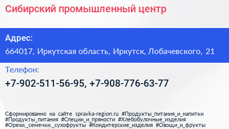 Сибирский промышленный центр по адресу 664017, Иркутская область, Иркутск, Лобачевского, 21 в дальнейшем Организация, размещена в следующих категориях:
