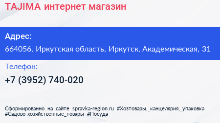 TAJIMA, интернет-магазин по адресу 664056, Иркутская область, Иркутск, Академическая, 31 в дальнейшем Организация, размещена в следующих категориях: