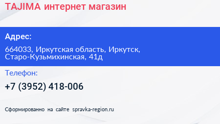 TAJIMA, интернет-магазин по адресу 664033, Иркутская область, Иркутск, Старо-Кузьмихинская, 41д в дальнейшем Организация, размещена в следующих категориях: