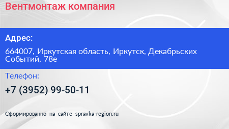 Вентмонтаж, компания по адресу 664007, Иркутская область, Иркутск, Декабрьских Событий, 78е в дальнейшем Организация, размещена в следующих категориях: