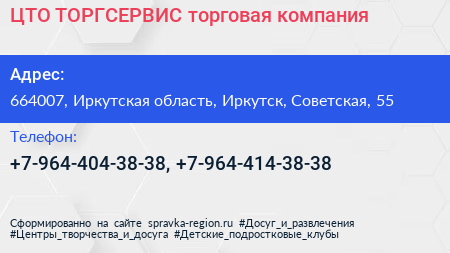 ЦТО ТОРГСЕРВИС, торговая компания по адресу 664007, Иркутская область, Иркутск, Советская, 55 в дальнейшем Организация, размещена в следующих категориях: