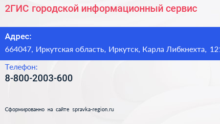 2ГИС, городской информационный сервис по адресу 664047, Иркутская область, Иркутск, Карла Либкнехта, 121 в дальнейшем Организация, размещена в следующих категориях: