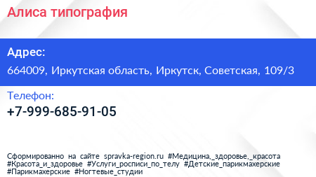 Алиса, типография по адресу 664009, Иркутская область, Иркутск, Советская, 109/3 в дальнейшем Организация, размещена в следующих категориях: