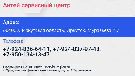 Антей, сервисный центр по адресу 664002, Иркутская область, Иркутск, Муравьёва, 17 в дальнейшем Организация, размещена в следующих категориях: