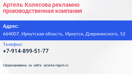 Артель Колесова, рекламно-производственная компания по адресу 664007, Иркутская область, Иркутск, Дзержинского, 52 в дальнейшем Организация, размещена в следующих категориях:
