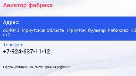 Авиатор, фабрика по адресу 664043, Иркутская область, Иркутск, бульвар Рябикова, 43 ст2 в дальнейшем Организация, размещена в следующих категориях: