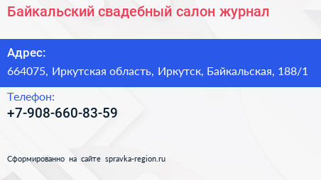 Байкальский свадебный салон, журнал по адресу 664075, Иркутская область, Иркутск, Байкальская, 188/1 в дальнейшем Организация, размещена в следующих категориях:
