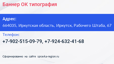 Баннер ОК, типография по адресу 664035, Иркутская область, Иркутск, Рабочего Штаба, 67 в дальнейшем Организация, размещена в следующих категориях: